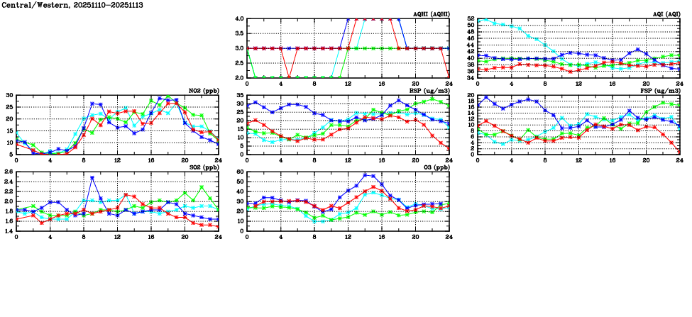 | Air Quality Data Time Series in Central/Western (2025/11/13) | ( Line colors: Day -3 Day -2 Day -1 Current day ) | 2D Map Current AQHI |