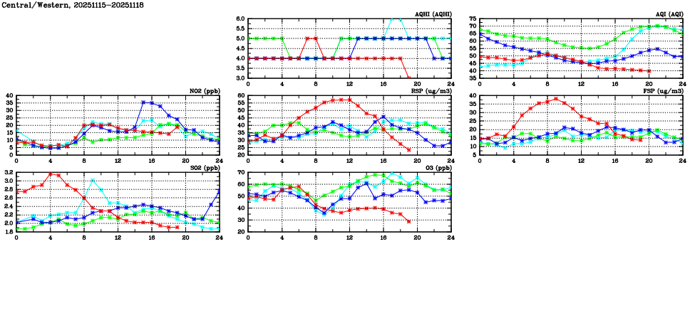 | Air Quality Data Time Series in Central/Western (2025/11/18) | ( Line colors: Day -3 Day -2 Day -1 Current day ) | 2D Map Current AQHI |