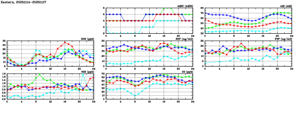 | Air Quality Data Time Series in Eastern (2025/11/17) | ( Line colors: Day -3 Day -2 Day -1 Current day ) | 2D Map Current AQHI |