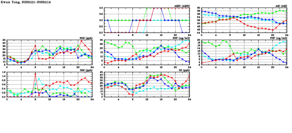 | Air Quality Data Time Series in Kwun Tong (2025/11/14) | ( Line colors: Day -3 Day -2 Day -1 Current day ) | 2D Map Current AQHI |