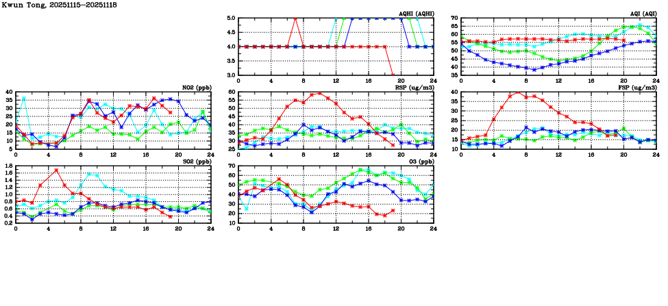 | Air Quality Data Time Series in Kwun Tong (2025/11/18) | ( Line colors: Day -3 Day -2 Day -1 Current day ) | 2D Map Current AQHI |