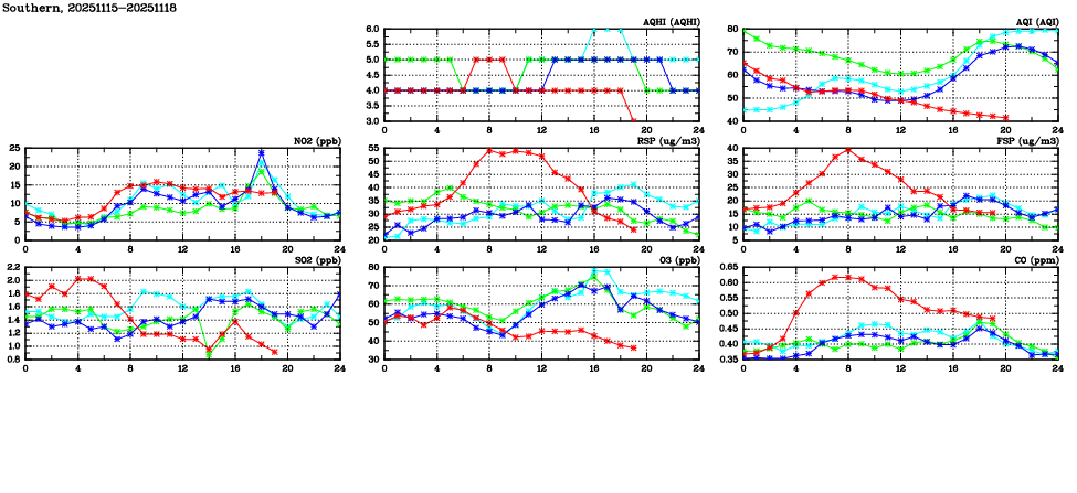 | Air Quality Data Time Series in Southern (2025/11/18) | ( Line colors: Day -3 Day -2 Day -1 Current day ) | 2D Map Current AQHI |