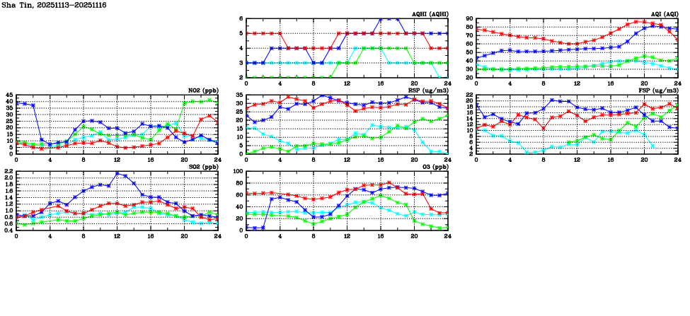 | Air Quality Data Time Series in Sha Tin (2025/11/16) | ( Line colors: Day -3 Day -2 Day -1 Current day ) | 2D Map Current AQHI |