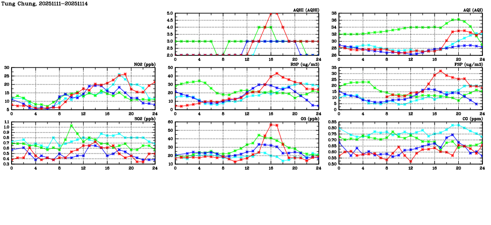 | Air Quality Data Time Series in Tung Chung (2025/11/14) | ( Line colors: Day -3 Day -2 Day -1 Current day ) | 2D Map Current AQHI |