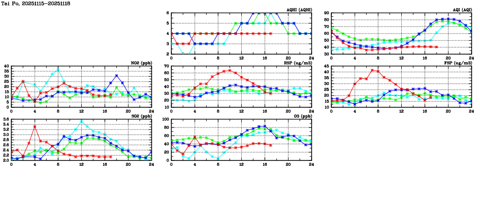 | Air Quality Data Time Series in Tai Po (2025/11/18) | ( Line colors: Day -3 Day -2 Day -1 Current day ) | 2D Map Current AQHI |