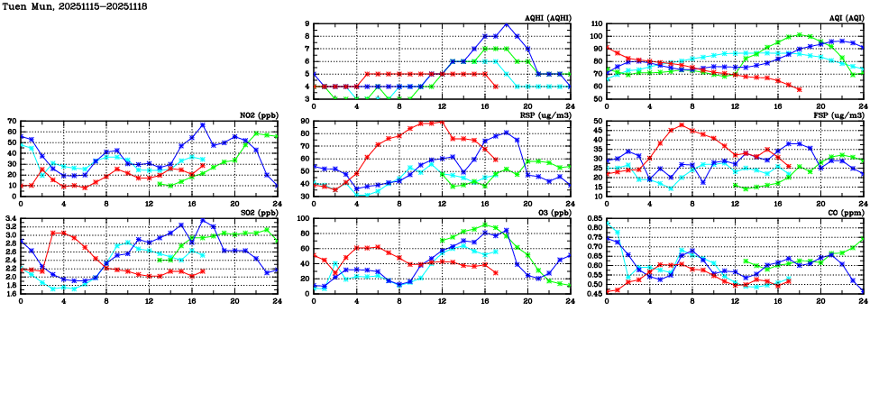 | Air Quality Data Time Series in Tuen Mun (2025/11/18) | ( Line colors: Day -3 Day -2 Day -1 Current day ) | 2D Map Current AQHI |