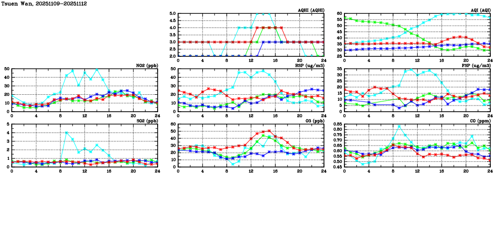 | Air Quality Data Time Series in Tsuen Wan (2025/11/12) | ( Line colors: Day -3 Day -2 Day -1 Current day ) | 2D Map Current AQHI |