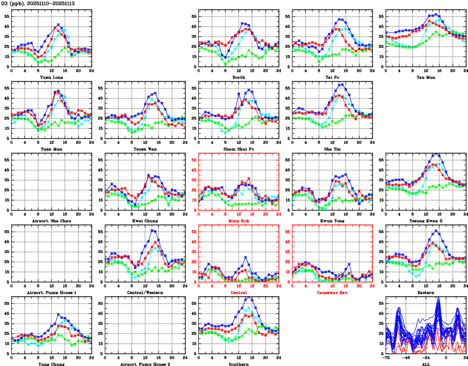 | Air Quality Data Time Series for O3 (2025/11/13) | ( Line colors: Day -3 Day -2 Day -1 Current day ) | 2D Map Current AQHI |