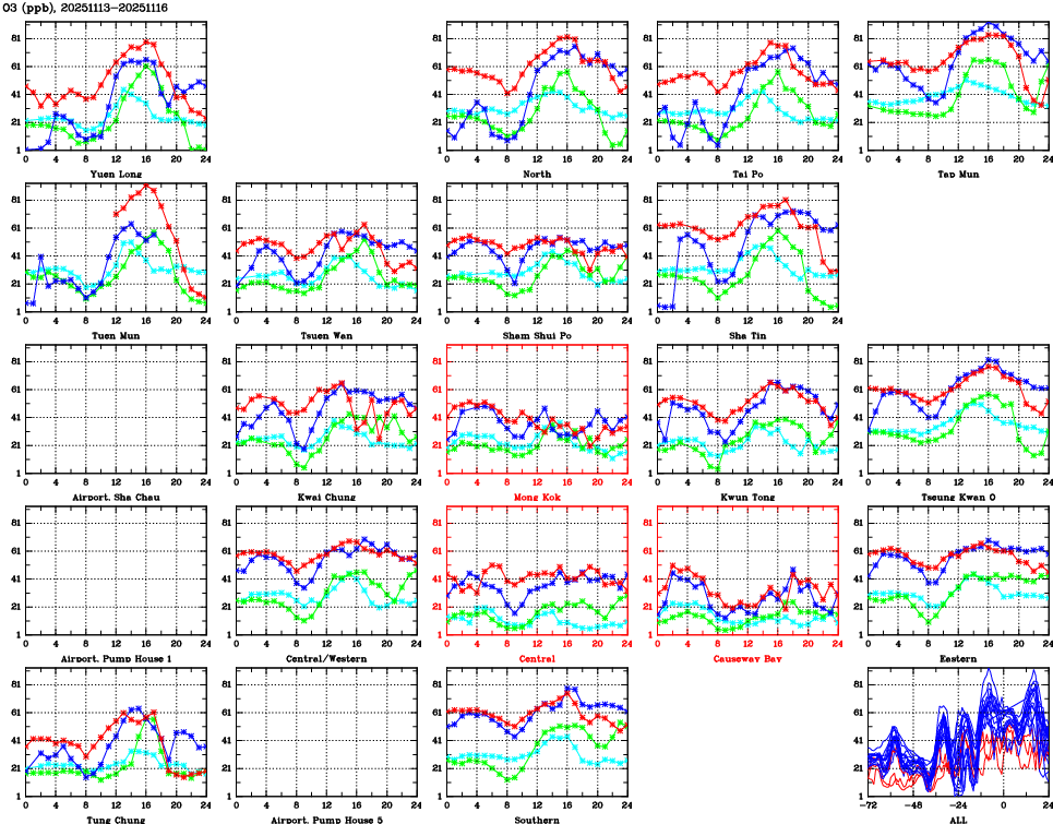 | Air Quality Data Time Series for O3 (2025/11/16) | ( Line colors: Day -3 Day -2 Day -1 Current day ) | 2D Map Current AQHI |