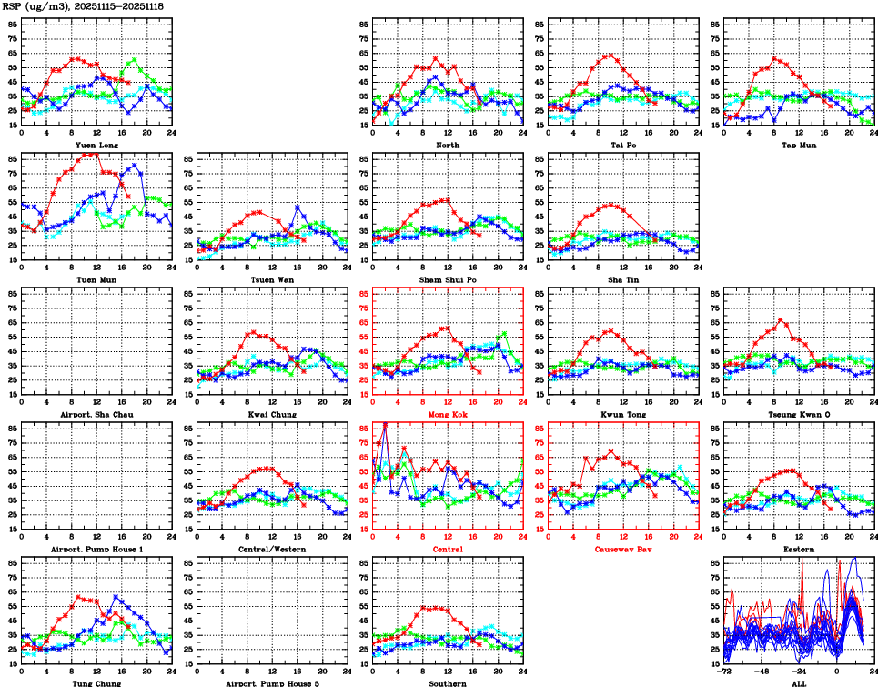 | Air Quality Data Time Series for RSP (2025/11/18) | ( Line colors: Day -3 Day -2 Day -1 Current day ) | 2D Map Current AQHI |