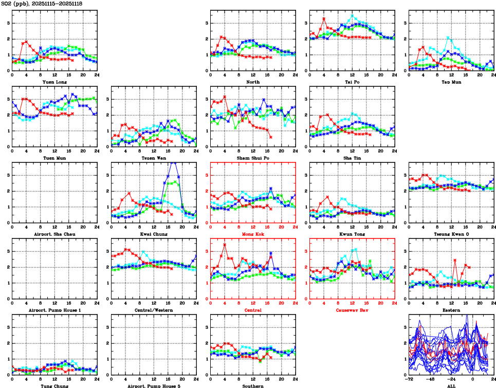 | Air Quality Data Time Series for SO2 (2025/11/18) | ( Line colors: Day -3 Day -2 Day -1 Current day ) | 2D Map Current AQHI |