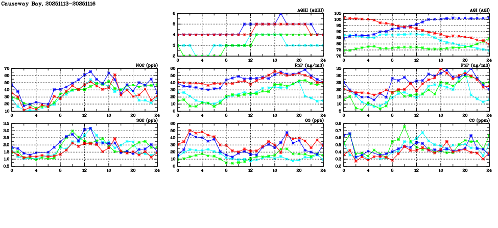 | Air Quality Data Time Series in Causeway Bay (2025/11/16) | ( Line colors: Day -3 Day -2 Day -1 Current day ) | 2D Map Current AQHI |