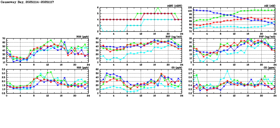 | Air Quality Data Time Series in Causeway Bay (2025/11/17) | ( Line colors: Day -3 Day -2 Day -1 Current day ) | 2D Map Current AQHI |