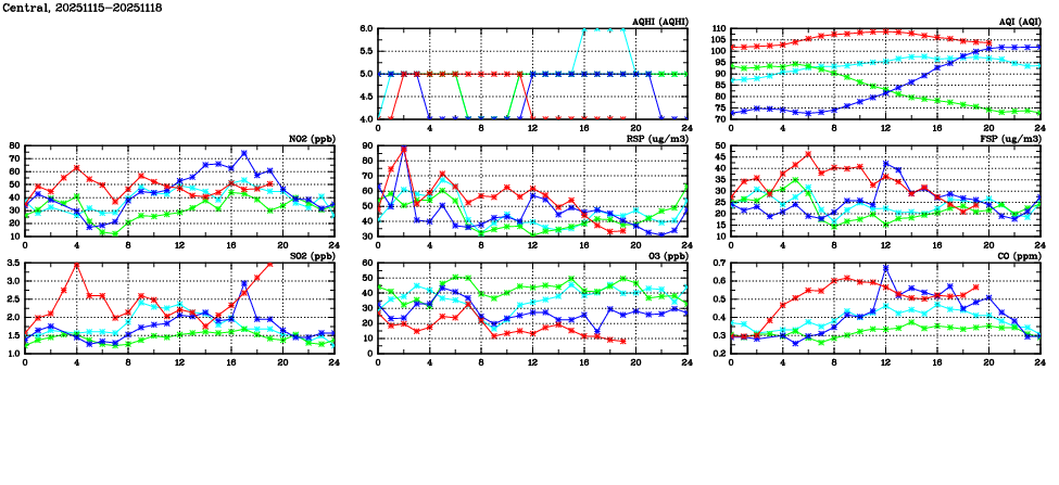 | Air Quality Data Time Series in Central (2025/11/18) | ( Line colors: Day -3 Day -2 Day -1 Current day ) | 2D Map Current AQHI |