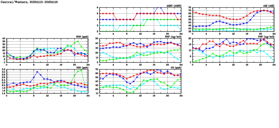 | Air Quality Data Time Series in Central/Western (2025/11/16) | ( Line colors: Day -3 Day -2 Day -1 Current day ) | 2D Map Current AQHI |