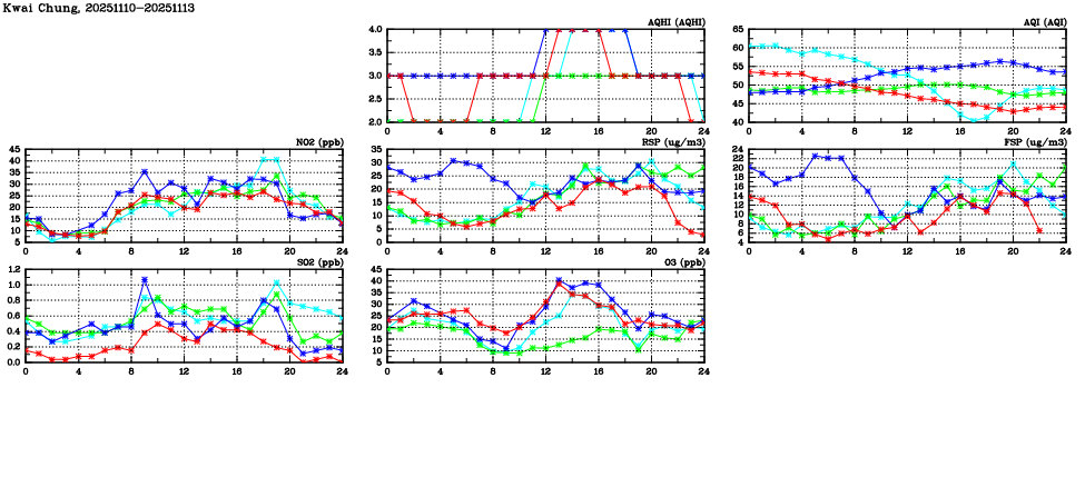 | Air Quality Data Time Series in Kwai Chung (2025/11/13) | ( Line colors: Day -3 Day -2 Day -1 Current day ) | 2D Map Current AQHI |