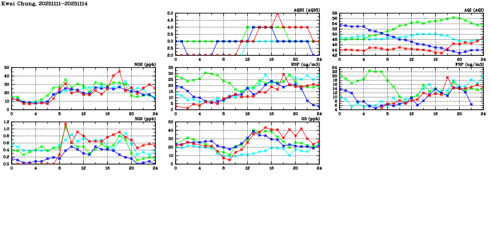 | Air Quality Data Time Series in Kwai Chung (2025/11/14) | ( Line colors: Day -3 Day -2 Day -1 Current day ) | 2D Map Current AQHI |
