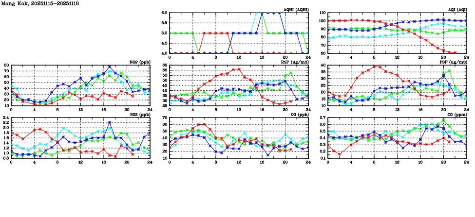 | Air Quality Data Time Series in Mong Kok (2025/11/18) | ( Line colors: Day -3 Day -2 Day -1 Current day ) | 2D Map Current AQHI |