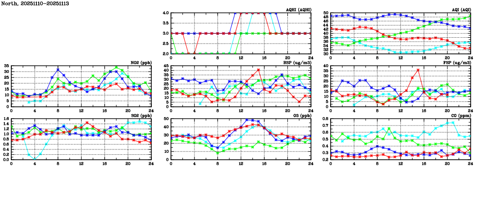 | Air Quality Data Time Series in North (2025/11/13) | ( Line colors: Day -3 Day -2 Day -1 Current day ) | 2D Map Current AQHI |