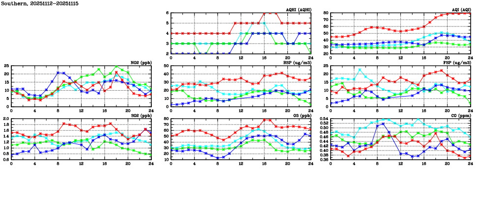 | Air Quality Data Time Series in Southern (2025/11/15) | ( Line colors: Day -3 Day -2 Day -1 Current day ) | 2D Map Current AQHI |