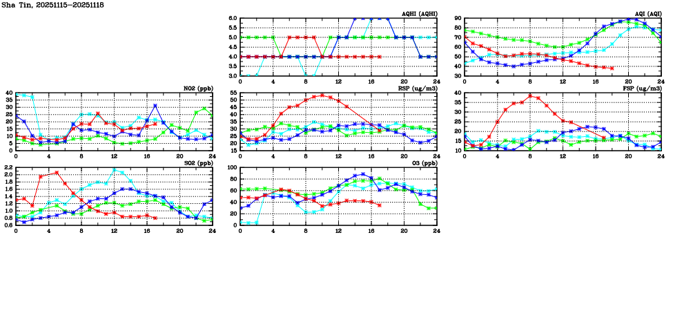 | Air Quality Data Time Series in Sha Tin (2025/11/18) | ( Line colors: Day -3 Day -2 Day -1 Current day ) | 2D Map Current AQHI |