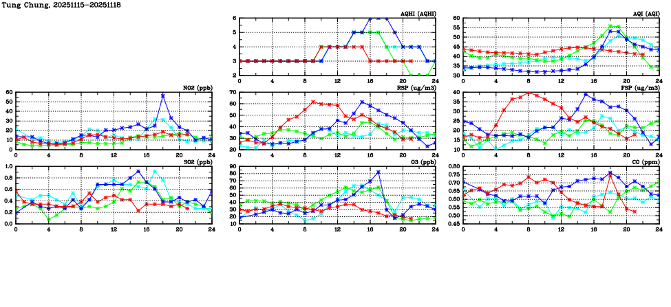 | Air Quality Data Time Series in Tung Chung (2025/11/18) | ( Line colors: Day -3 Day -2 Day -1 Current day ) | 2D Map Current AQHI |
