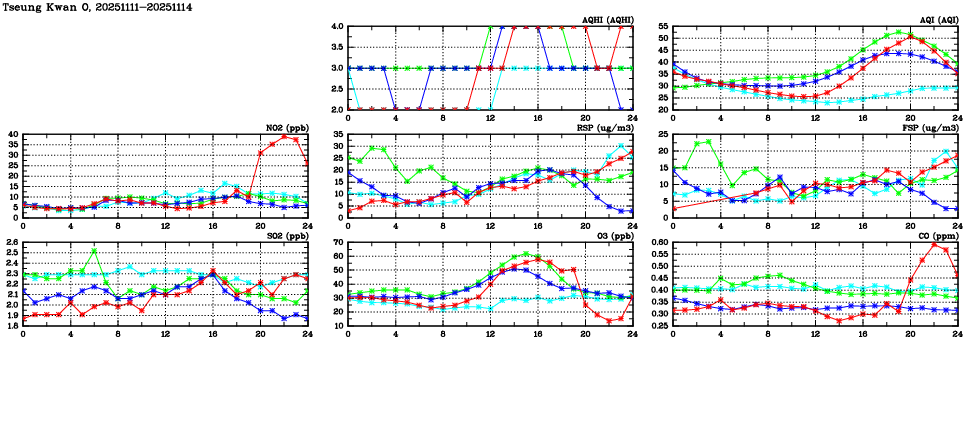 | Air Quality Data Time Series in Tseung Kwan O (2025/11/14) | ( Line colors: Day -3 Day -2 Day -1 Current day ) | 2D Map Current AQHI |