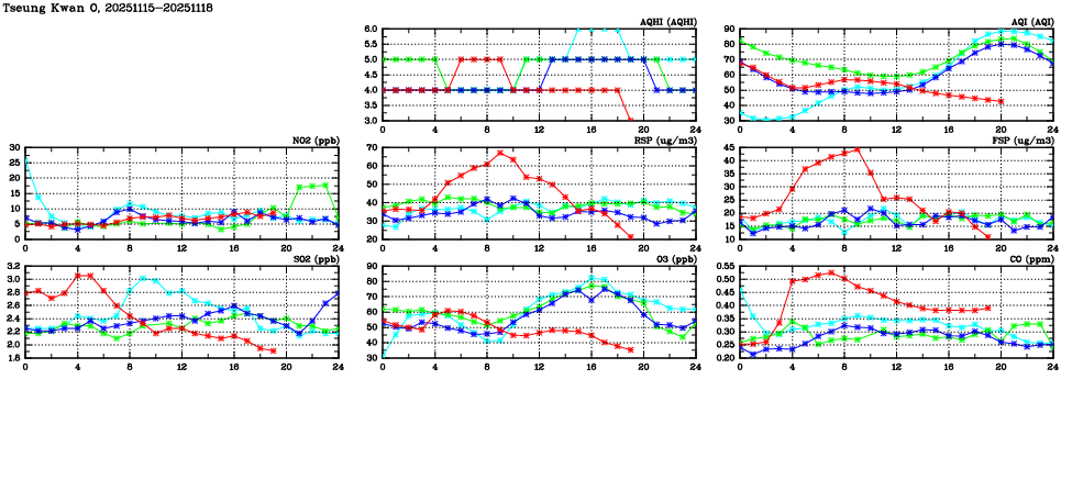 | Air Quality Data Time Series in Tseung Kwan O (2025/11/18) | ( Line colors: Day -3 Day -2 Day -1 Current day ) | 2D Map Current AQHI |