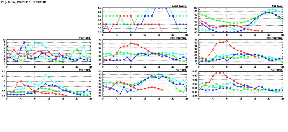 | Air Quality Data Time Series in Tap Mun (2025/11/18) | ( Line colors: Day -3 Day -2 Day -1 Current day ) | 2D Map Current AQHI |