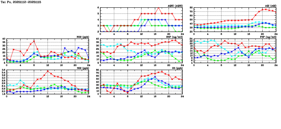 | Air Quality Data Time Series in Tai Po (2025/11/15) | ( Line colors: Day -3 Day -2 Day -1 Current day ) | 2D Map Current AQHI |