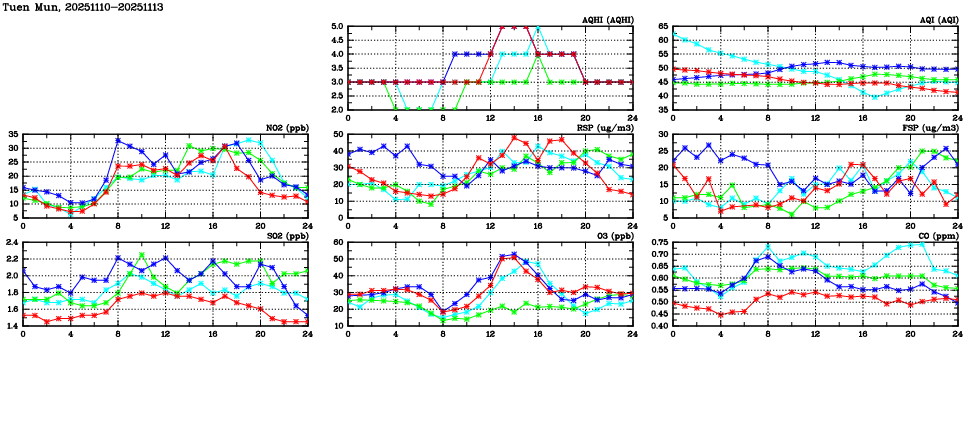 | Air Quality Data Time Series in Tuen Mun (2025/11/13) | ( Line colors: Day -3 Day -2 Day -1 Current day ) | 2D Map Current AQHI |