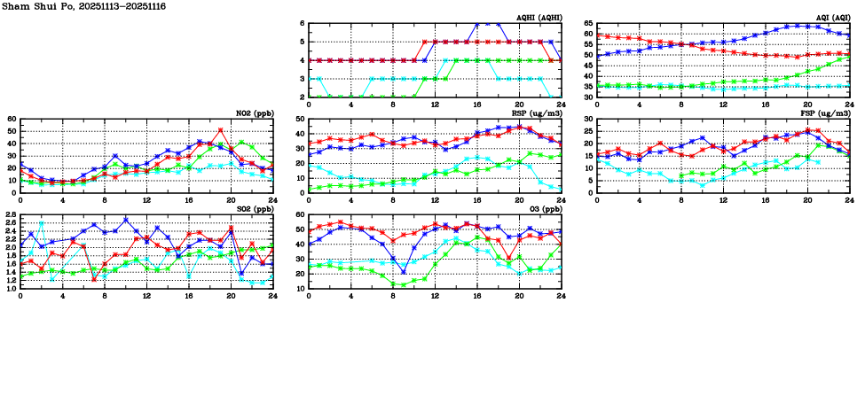 | Air Quality Data Time Series in Sham Shui Po (2025/11/16) | ( Line colors: Day -3 Day -2 Day -1 Current day ) | 2D Map Current AQHI |
