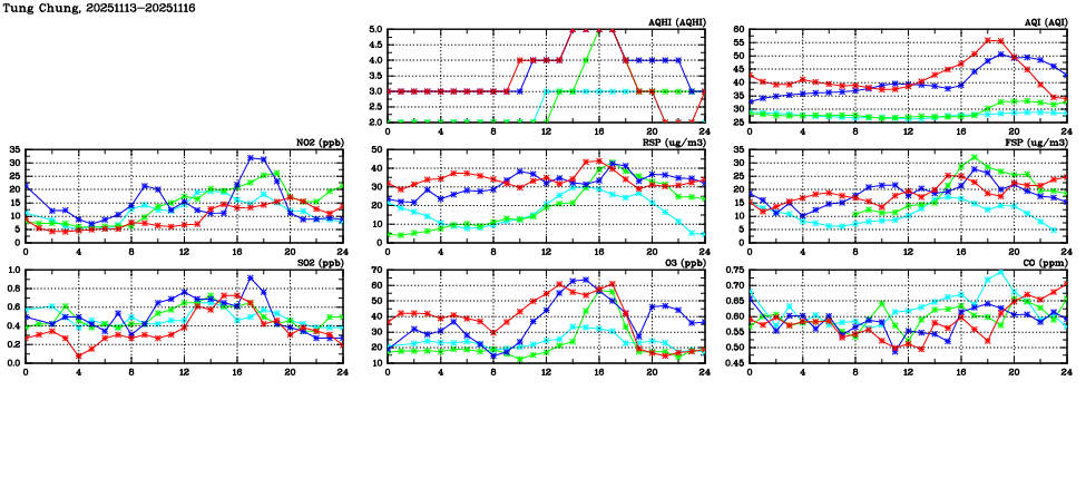 | Air Quality Data Time Series in Tung Chung (2025/11/16) | ( Line colors: Day -3 Day -2 Day -1 Current day ) | 2D Map Current AQHI |