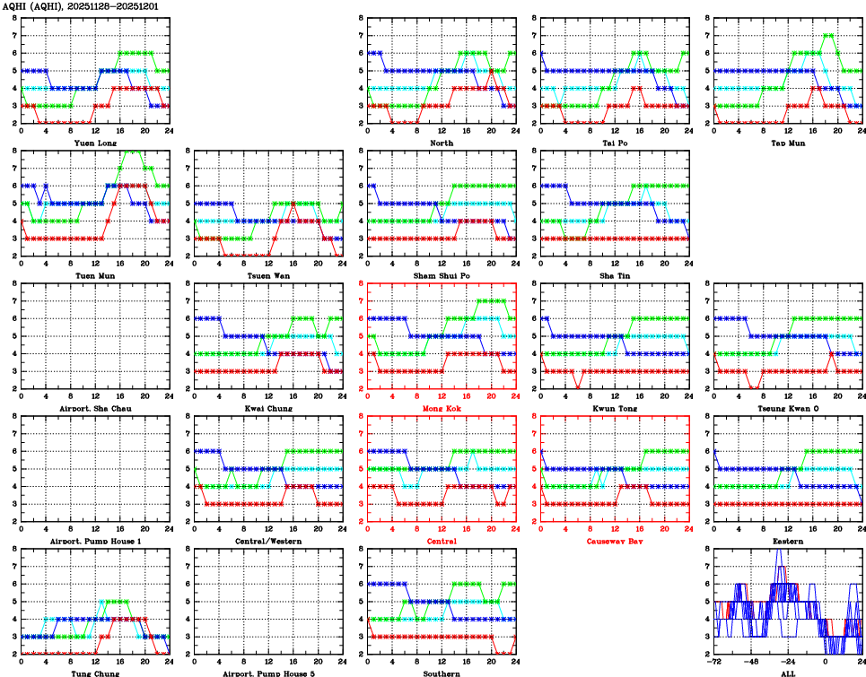 | Air Quality Data Time Series for AQHI (2025/12/01) | ( Line colors: Day -3 Day -2 Day -1 Current day ) | 2D Map Current AQHI |
