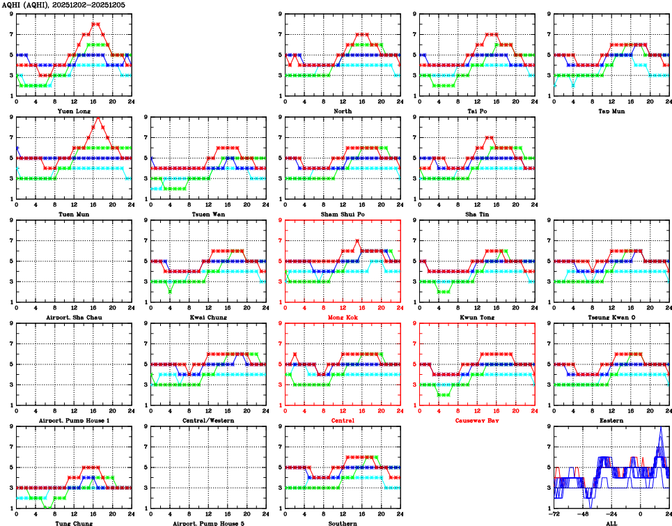 | Air Quality Data Time Series for AQHI (2025/12/05) | ( Line colors: Day -3 Day -2 Day -1 Current day ) | 2D Map Current AQHI |