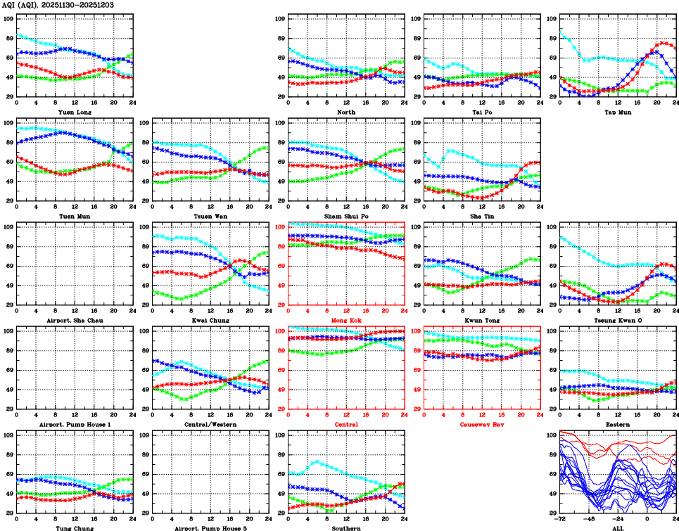 | Air Quality Data Time Series for AQI (2025/12/03) | ( Line colors: Day -3 Day -2 Day -1 Current day ) | 2D Map Current AQHI |