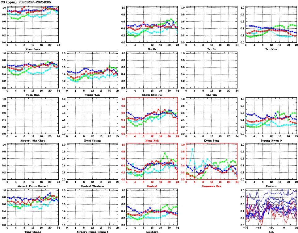 | Air Quality Data Time Series for CO (2025/12/05) | ( Line colors: Day -3 Day -2 Day -1 Current day ) | 2D Map Current AQHI |