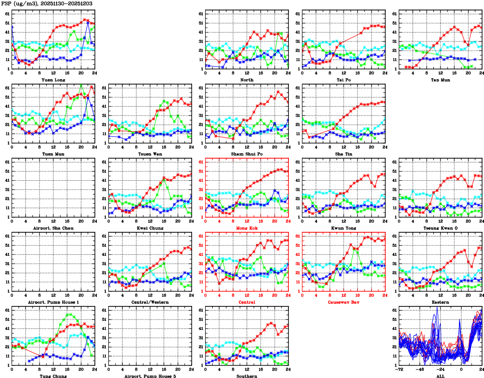| Air Quality Data Time Series for FSP (2025/12/03) | ( Line colors: Day -3 Day -2 Day -1 Current day ) | 2D Map Current AQHI |
