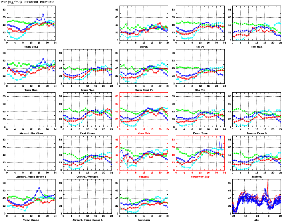 | Air Quality Data Time Series for FSP (2025/12/06) | ( Line colors: Day -3 Day -2 Day -1 Current day ) | 2D Map Current AQHI |
