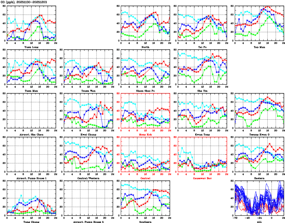 | Air Quality Data Time Series for O3 (2025/12/03) | ( Line colors: Day -3 Day -2 Day -1 Current day ) | 2D Map Current AQHI |