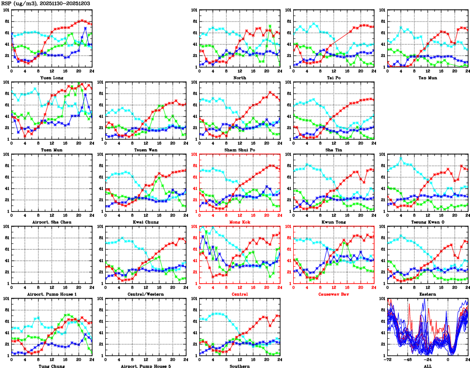 | Air Quality Data Time Series for RSP (2025/12/03) | ( Line colors: Day -3 Day -2 Day -1 Current day ) | 2D Map Current AQHI |