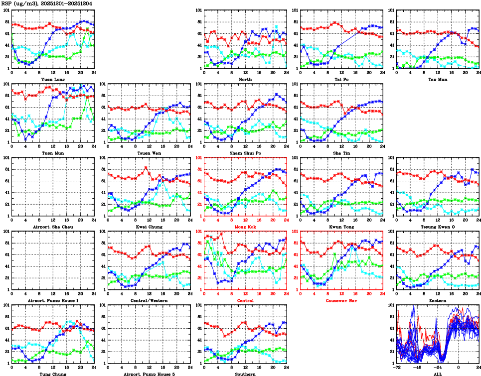 | Air Quality Data Time Series for RSP (2025/12/04) | ( Line colors: Day -3 Day -2 Day -1 Current day ) | 2D Map Current AQHI |