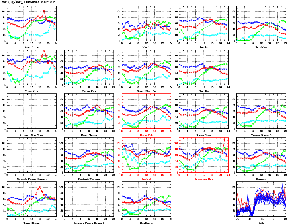 | Air Quality Data Time Series for RSP (2025/12/05) | ( Line colors: Day -3 Day -2 Day -1 Current day ) | 2D Map Current AQHI |