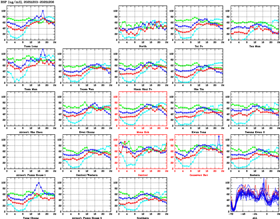 | Air Quality Data Time Series for RSP (2025/12/06) | ( Line colors: Day -3 Day -2 Day -1 Current day ) | 2D Map Current AQHI |