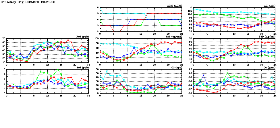 | Air Quality Data Time Series in Causeway Bay (2025/12/03) | ( Line colors: Day -3 Day -2 Day -1 Current day ) | 2D Map Current AQHI |