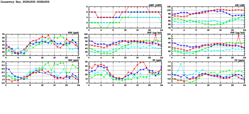| Air Quality Data Time Series in Causeway Bay (2025/12/05) | ( Line colors: Day -3 Day -2 Day -1 Current day ) | 2D Map Current AQHI |