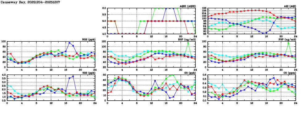 | Air Quality Data Time Series in Causeway Bay (2025/12/07) | ( Line colors: Day -3 Day -2 Day -1 Current day ) | 2D Map Current AQHI |