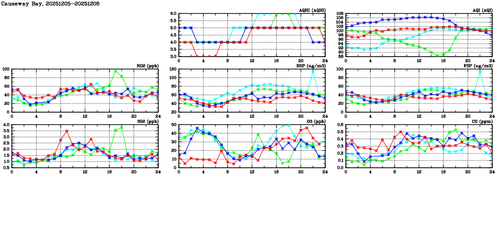 | Air Quality Data Time Series in Causeway Bay (2025/12/08) | ( Line colors: Day -3 Day -2 Day -1 Current day ) | 2D Map Current AQHI |