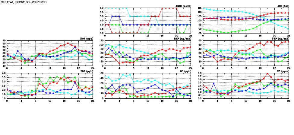 | Air Quality Data Time Series in Central (2025/12/03) | ( Line colors: Day -3 Day -2 Day -1 Current day ) | 2D Map Current AQHI |