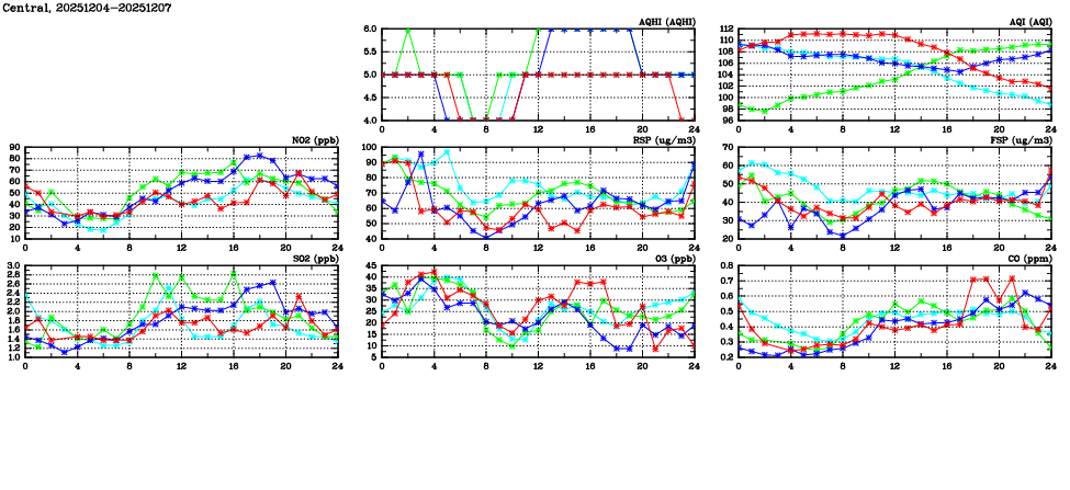 | Air Quality Data Time Series in Central (2025/12/07) | ( Line colors: Day -3 Day -2 Day -1 Current day ) | 2D Map Current AQHI |